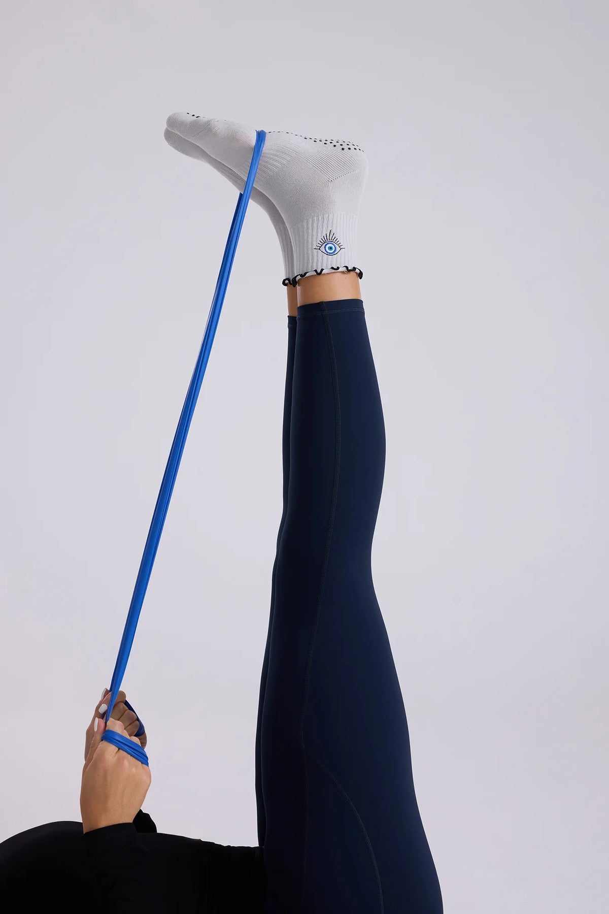 Lucky Eye Socks are designed to bring comfort and good vibes to your Pilates flow. In soft light gray with black ruffle trim and matching grips, they feature a delicate blue eye embroidery on the side, a subtle symbol of positivity and protection. Non-slip soles keep you grounded with every move.