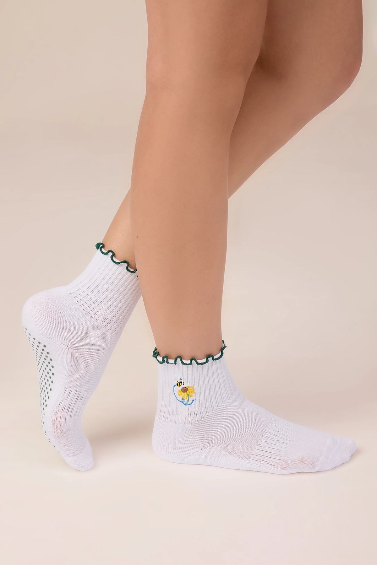 Don’t Kill My Buzz Socks bring a playful edge to your Pilates look. With green ruffle trim, matching grips, and a flower with bee embroidery on the side, they’re designed to support your movement while adding a fun pop of detail. The non-slip sole keeps you steady from warm-up to cool down.