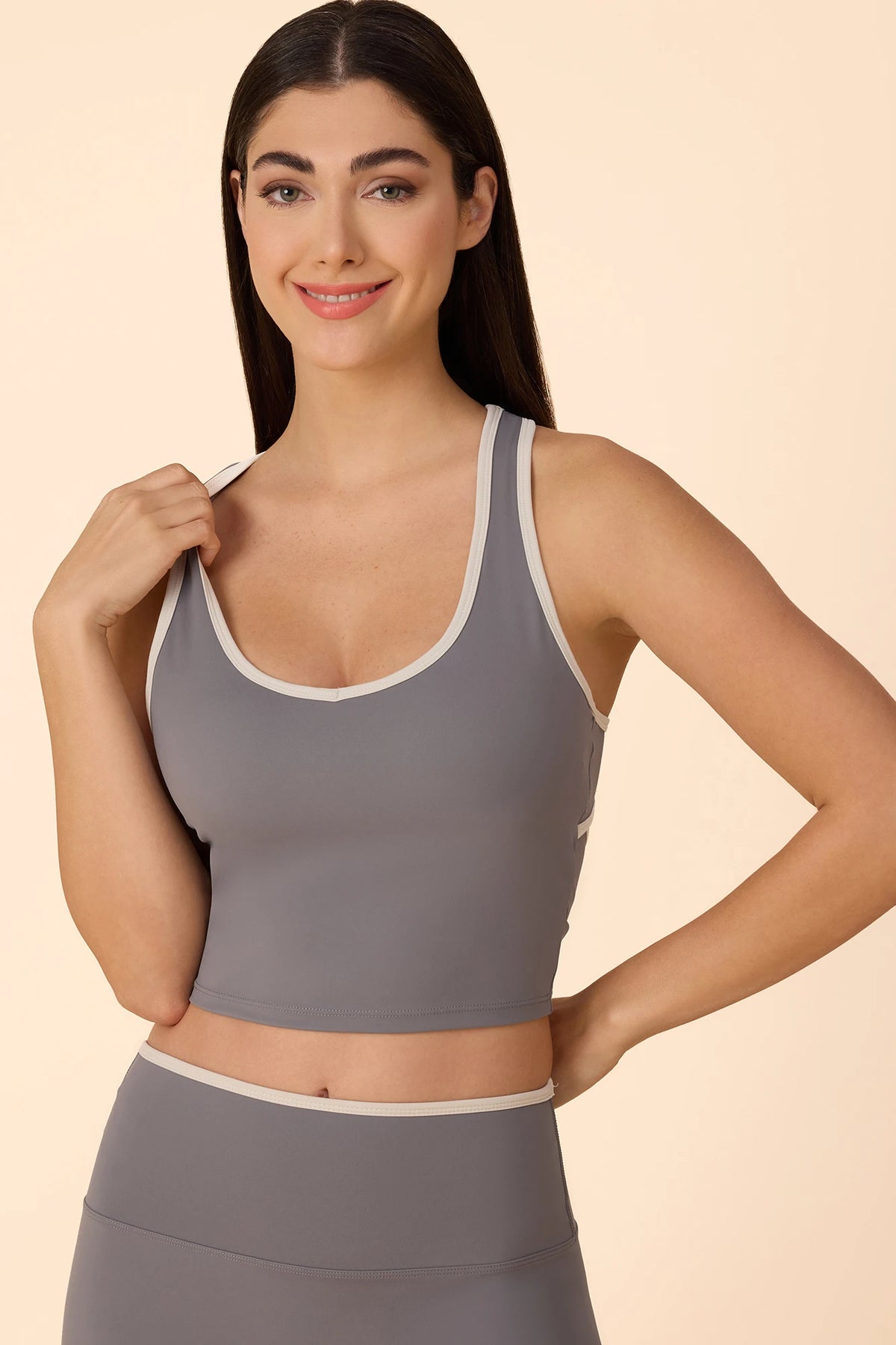 The Mira Tank is a soft, sculpting layer designed for controlled movement and everyday studio wear. The clean racer cut with contrast trimming gives it a refined, feminine finish, while the built-in support with removable cups provides confidence and ease whether worn alone or layered. Finished in a buttery fabric that moves with you, it’s the kind of piece you reach for on repeat.